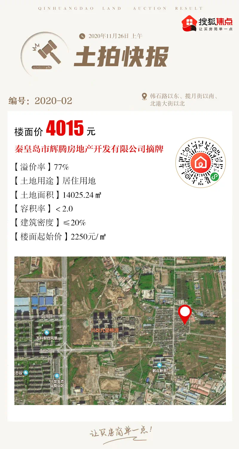 秦皇岛辉腾房地产竞得海港区韩庄一宗居住用地,土地总面积约21亩,楼面价4015元,溢价率77%。
