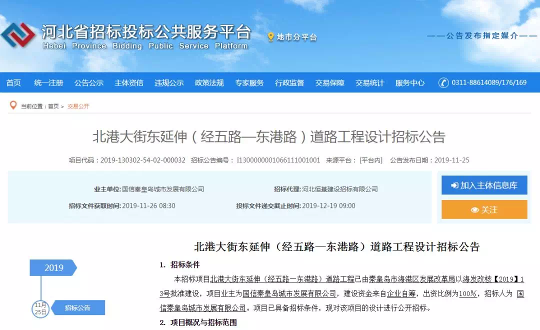 本招标项目北港大街东延伸(经五路—东港路)道路工程已由秦皇岛市海港区发展改革局以海发改核【2019】13号批准建设,项目业主为国信秦皇岛城市发展有限公司,建设资金来自企业自筹,出资比例为100%。海港经济开发区西起经五路,东至东港路。