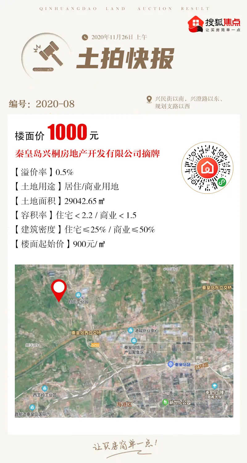 秦皇岛兴桐房地产拍得海港区杜庄两宗土地,其中一宗属于居住商业混合用地,两宗土地总面积约96亩,楼面价1000元,溢价率0.5%。
