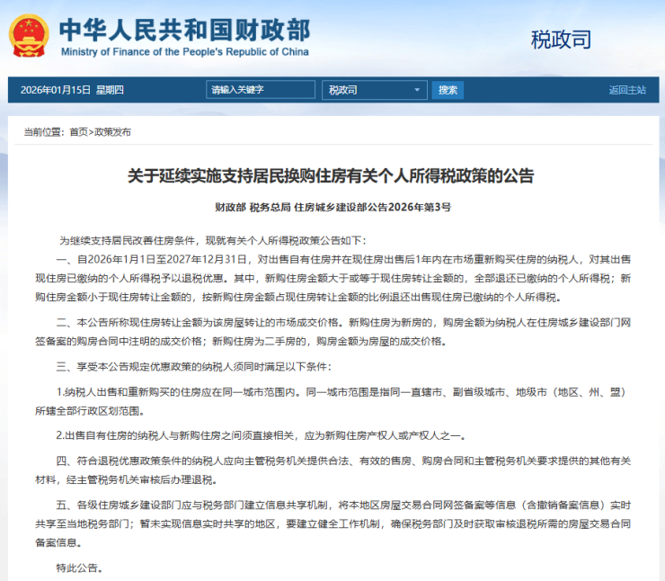 财政部 税务总局 住房城乡建设部 2026年1月12日