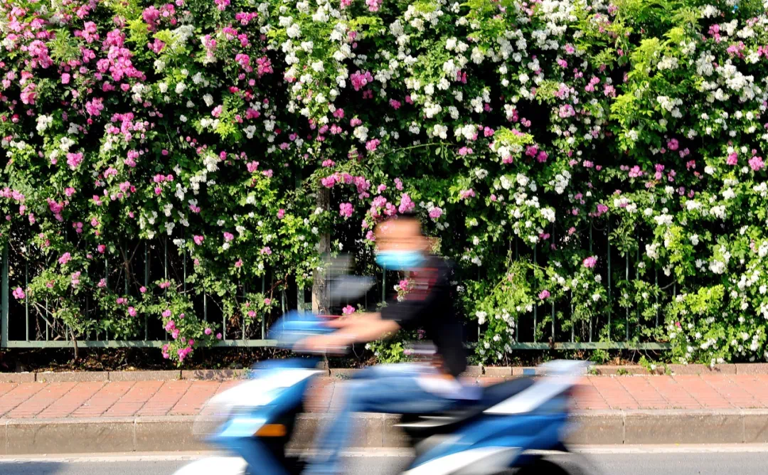 广场西路康乐街至海阳路段,人民公园外围,大片蔷薇花依傍着围栏绽放。