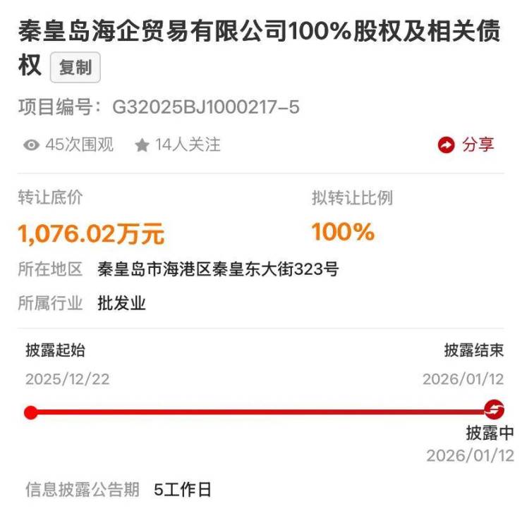 近日中国海航(中国海洋航空集团有限公司)在北交所挂牌旗下全资子公司“秦皇岛海企贸易有限公司100%股权及相关债权”,转让底价合计1140.548万元。