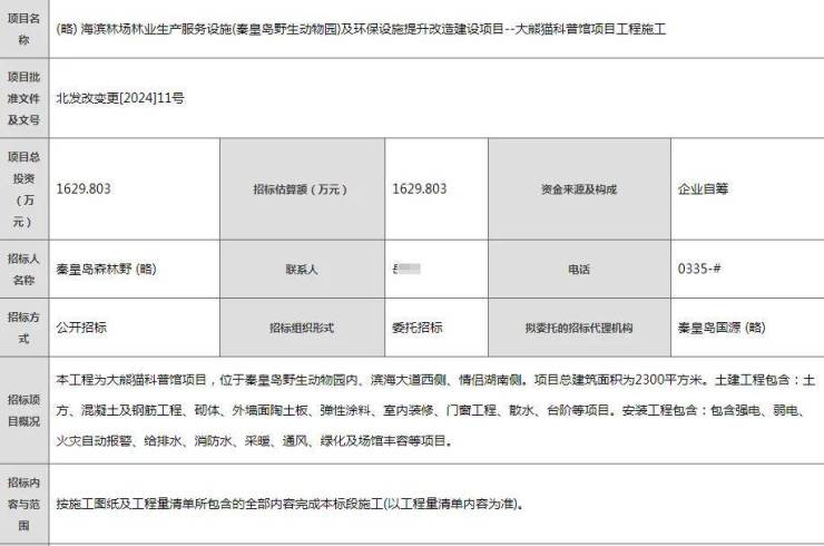 公开信息显示:本工程为大熊猫科普馆项目,位于秦皇岛野生动物园内、滨海大道西侧、情侣湖南侧。项目总建筑面积为2300平方米。