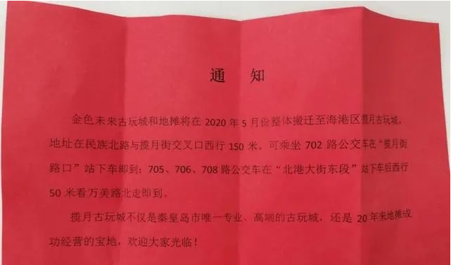 4月25日,揽月古玩城发布通知:金色未来古玩城和地摊将在2020年5月份整体搬迁至海港区揽月古玩城。