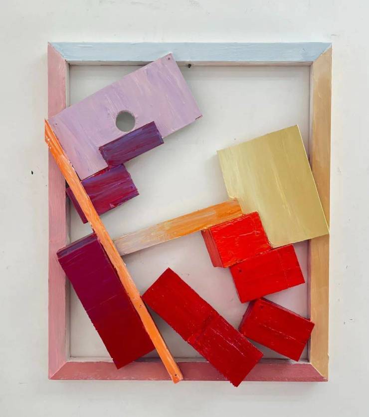 废⽊料、旧电线、空瓶盖、⾃拍杆、拆下的空调滤芯、有机玻璃、枯树枝、电熨⽃、失灵的⿏标、空药盒、⽼化的空⽓净化器部件等等,⼀切都是等待回收的废弃物,这些⽇常⽣活物件的拼合产⽣了类似“拉图尔连祷”的句式(物件的组合也是⼀种语法),正是这些寻常物,这些纯粹来⾃艺术家私⼈⽇常⽣活的废弃物,被⽼范重新组装成绘画与物件之间不同寻常的关系形式。