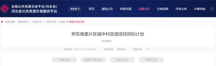 近日,河北省公共资源交易服务平台发布“桥东南里片区城中村改造项目招标计划”。项目总投资22.24亿元,招标估算额11.11亿元,资金来源为企业自筹及贷款,招标人为秦皇岛市民达房地产开发有限公司。