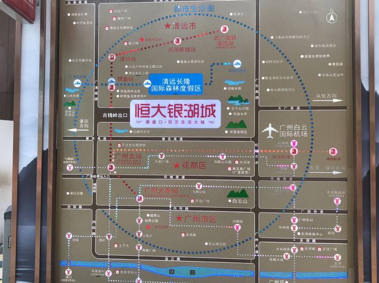 从天河出发,沿内环路行驶进入广清高速,前行至银盏(古钱岭)出口即可到达恒大银湖城