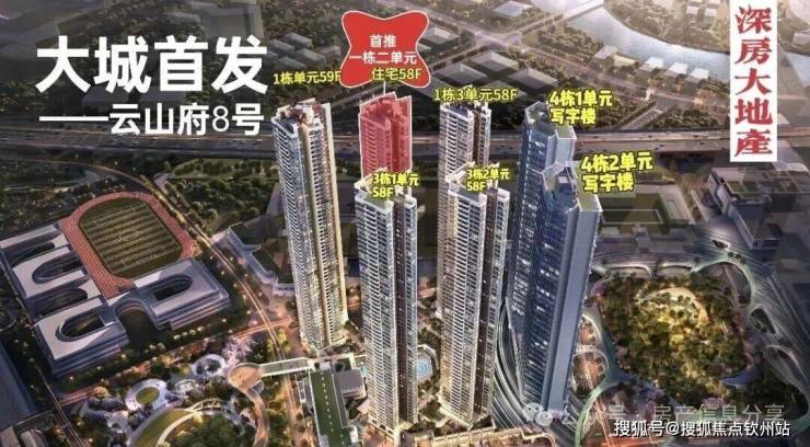 项目由8座建筑分2排组成,1栋1-2-3单元和3栋1-2单元为58-59层(约180米)住宅,标准层高2.9米,4梯6户;4栋1-2单元为35层(约165米)写字楼,2栋为幼儿园。地块住宅均为商品房性质,有1566户,配2220辆车位。