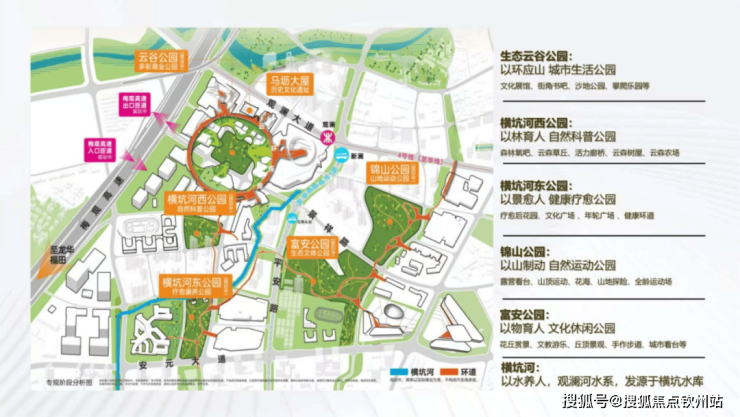 独创规划超3.6km空中连廊,串联5大公园,商业,住区、办公、文化休闲、生态康养等多个特色主题环游路线,超23公顷的生态公园,奢享密度比肩香蜜湖。