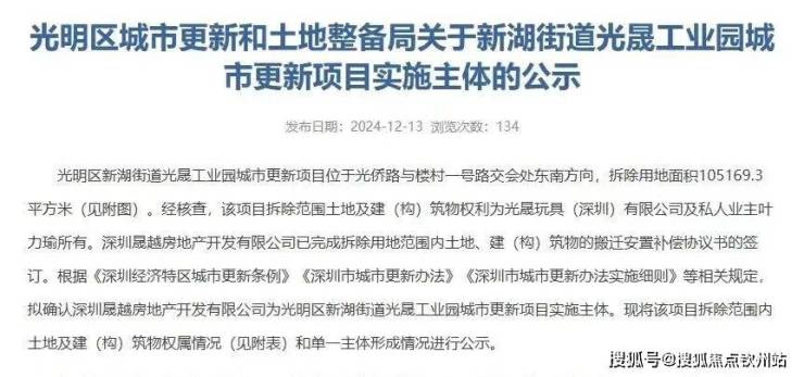 近日,深圳市光明区城市更新和土地整备局公示新湖街道光晟工业园城市更新项目实施主体,拟确认为深圳晟越房地产开发有限公司,深圳晟越背后则站着越秀资本,也就是同在越秀集团旗下,越秀地产的兄弟公司;