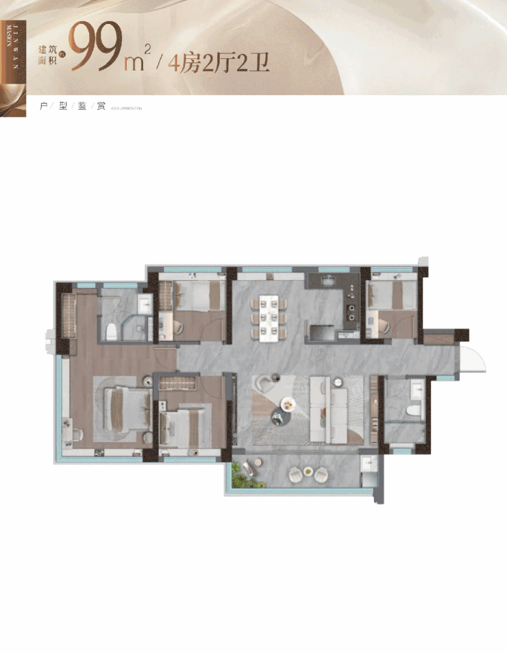 建面约99m²4房户型,融入“小豪宅”设计理念,是适合刚改家庭的舒适四房。