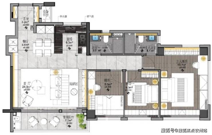 将L-living room(客厅)、D-dinning room(餐厅)、K-kitchen(厨房)和G-garden bal- cony(花园阳台)四个公共区域融为一体,生活动线更合理,空间感更强,尽显通透;