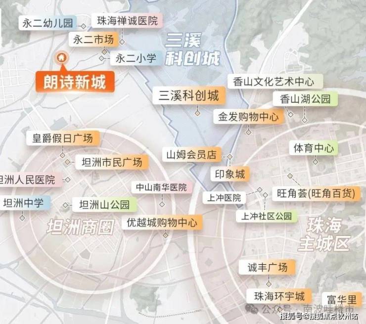 商业配套:山姆商圈(山姆会员店、奥园广场,10分钟)、坦洲商圈(皇爵假日广场、优越城购物中心,15分钟)、南湾商圈(珠海环宇城、诚丰广场、华发商都,15分钟)、富华里商圈(富华里、玖洲道、摩尔广场,20分钟)