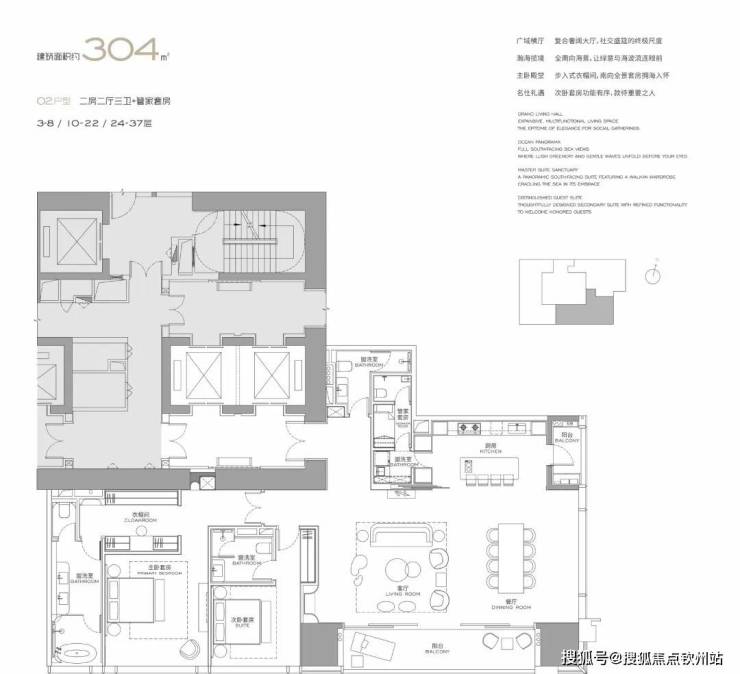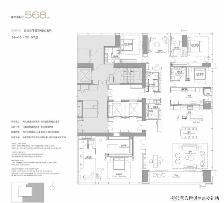 (3-57层)T3栋 四房四卫+家政套间。中西厨分区,餐客西厨一体,带多功能房。端头位置,三面采光。功能完备,房间数充足;实现了主仆双动线;会客观景视野一流。