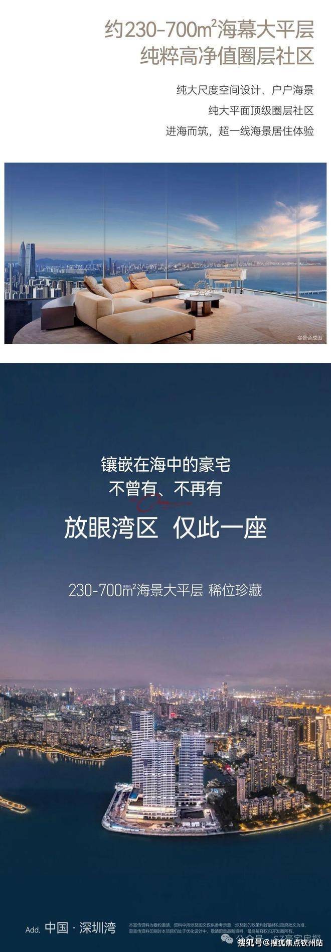 内部配套:配备高端私密会所、约 766 平方米的深圳首个悬空无边际海景泳池、首层城市花园、健身房、儿童游乐区以及 1800 平方米的海洋博物馆等设施。