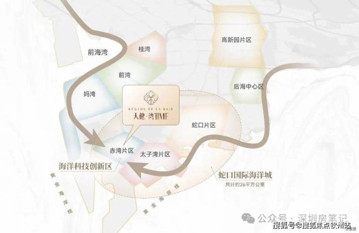 项目位于南山区赤湾,赤湾六路与天后宫路交汇处东侧。赤湾雄踞"蛇口-太子湾-前海湾"海岸线C位,左承前海发展辐射,右享蛇口国际高端生活方式,独享发展高端国际海洋科技规划,未来将实现超2000亿产值,吸纳约6万高端人才集聚,是深圳西海岸线发展的最后一块拼图。项目聚合了湾区+特区+示范区+自贸区四重国家战略红利。