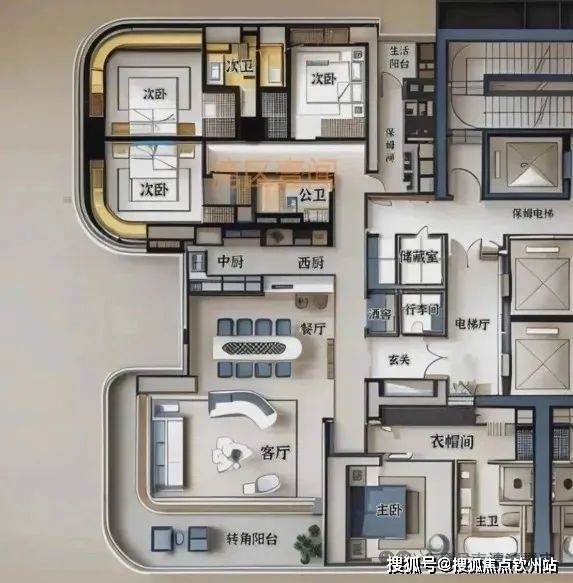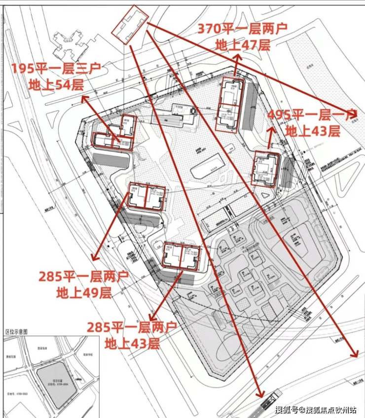 :计容建面15.6万㎡,共419套,含195㎡、285㎡、350㎡、495㎡四大户型,层高43-54层,梯户比最高达3梯1户(顶豪专享)。