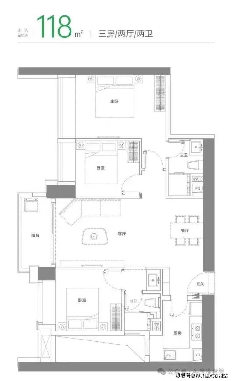 建面约118㎡三房两厅两卫