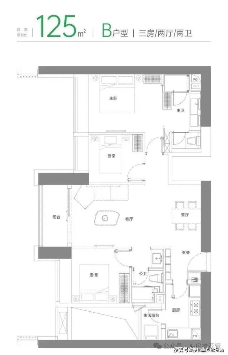 B户型 建面约125㎡三房两厅两卫