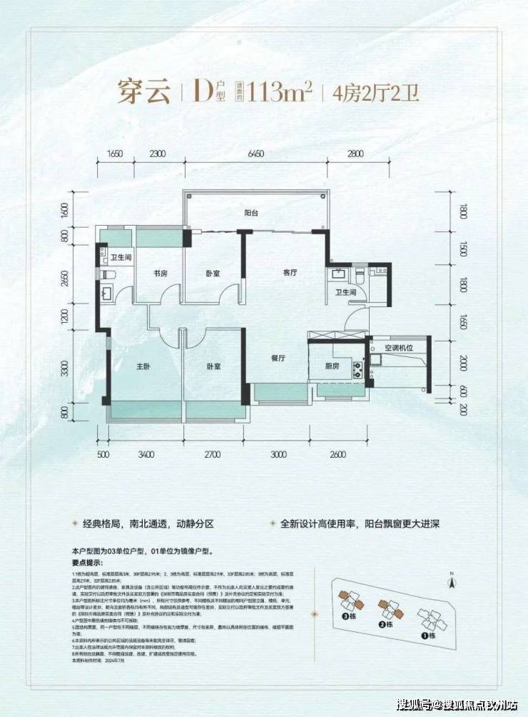 113㎡的4房2厅2卫,设计的是竖厅南北通透格局,进门入户玄关,客厅连接次卧出6.45米长的大阳台,四开间朝南,4个卧室分别做到了3.4米/2.7米/2.7米/2.3米的宽度,主卧大套房设计,U型厨房,公卫三段式分离设计,得房率约:81.39%(不含赠送),阳台主朝东北向,看科学公园景观。