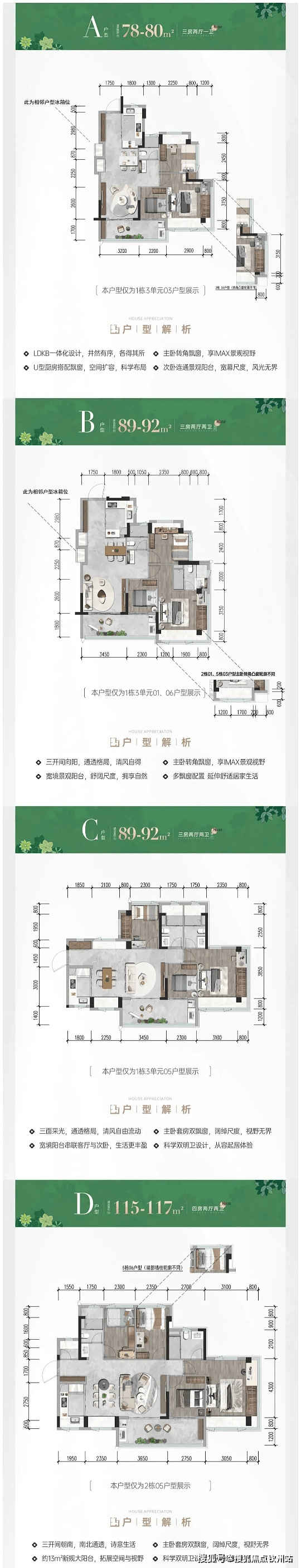 117㎡四房两厅两卫:横厅设计,南北通透,约 13㎡大阳台,总价约 606-653 万,拓展后使用率最高达 105%。