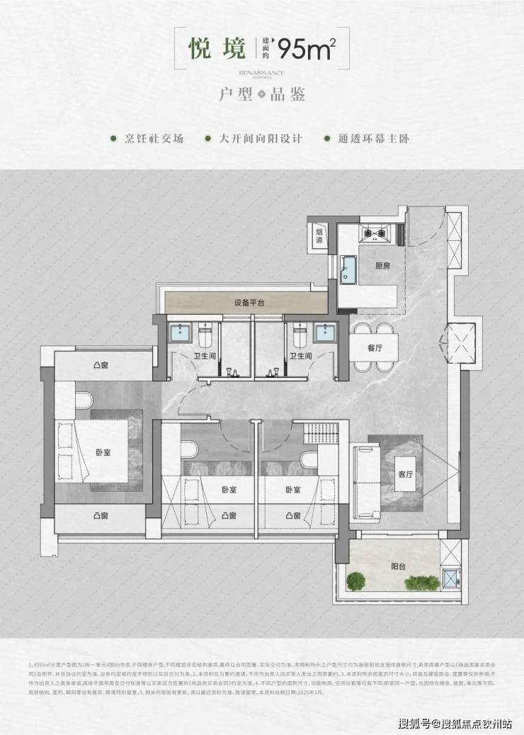 • 得房率:通过创新性的飘窗、双阳台改造、设备平台赠送等设计,实现平均94-96%的惊人得房率。