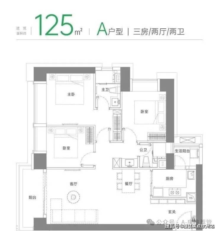 A户型 建面约125㎡三房两厅两卫