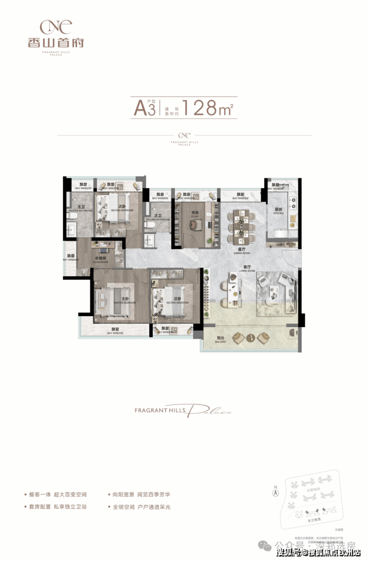 亮点:三开间朝南主卧,270°飘窗设计,最大化赠送