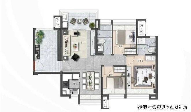 这个户型是上乘蓝岸的皇牌户型,88㎡就能做到4房,得房率110%。