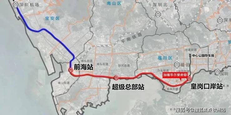 轨道:穗莞深城际轨道2站直达前海,联通两大深港合作区;穗莞深城际(建设中)延长线——穗莞深城际前海至皇岗口岸段设有皇岗口岸站,途径南山、福田等地,建成通车后2站到前海,1站到深圳湾总部基地。