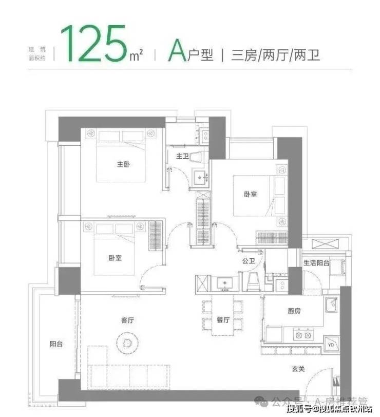 A户型 建面约125㎡三房两厅两卫