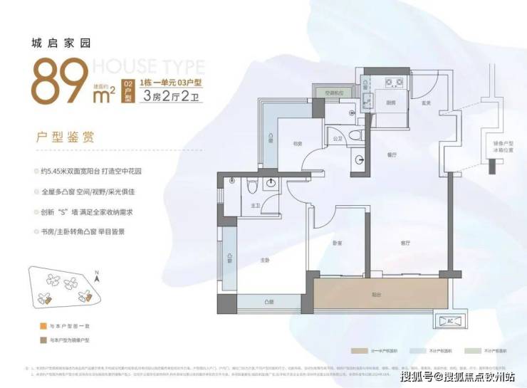 (1)79㎡三房两厅两卫:竖厅布局,三开间朝南,主卧及一次卧带270°飘窗,U型厨房,得房率约90%。