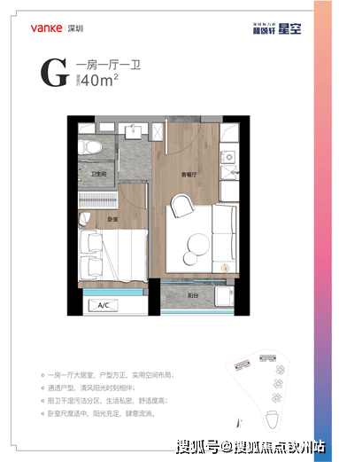 ②约40㎡产品:一房一厅大居室,户型方正,厨卫干湿污洁分区,卧室尺度舒适,生活私密,实用空间布局;