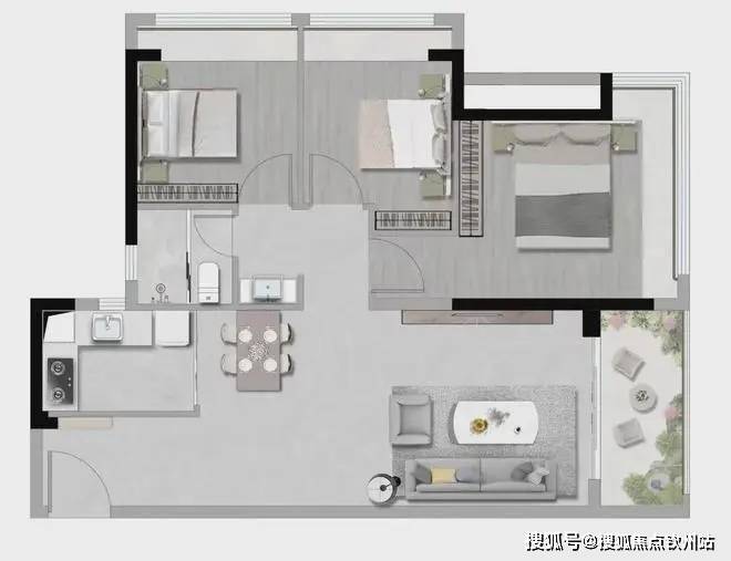 (1)72㎡两房:适合小家庭或单身人士,竖厅格局,客厅开间3.5米,主卧约12.93㎡,次卧约9.99㎡(含飘窗),L型厨房搭配干湿分离卫生间。 总价260万左右;
