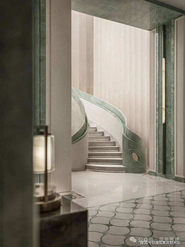 旋转楼梯中央,玉石灯柱如垂瀑而下。