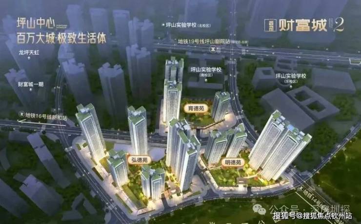 深圳财富城2期位于坪山区高铁新城金丰路与和安路交汇处西侧,地处坪山核心区域,是坪山区最顶流的居住区。该楼盘总占地面积约4.54万㎡,总建筑面积约35.8万㎡,共分为3个地块开发,分别为财富城弘德苑、财富城明德苑、财富城育德苑。