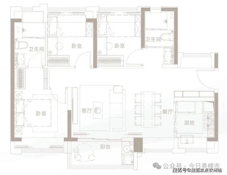 此户型为三面采光格局,整体空间明亮通透。L型厨房设计合理,操作便捷;明厨明卫,双面采光卧室,营造舒适的起居环境。该户型非常适合首次置业或预算有限的刚需家庭,在有限面积内实现了三房的功能性。