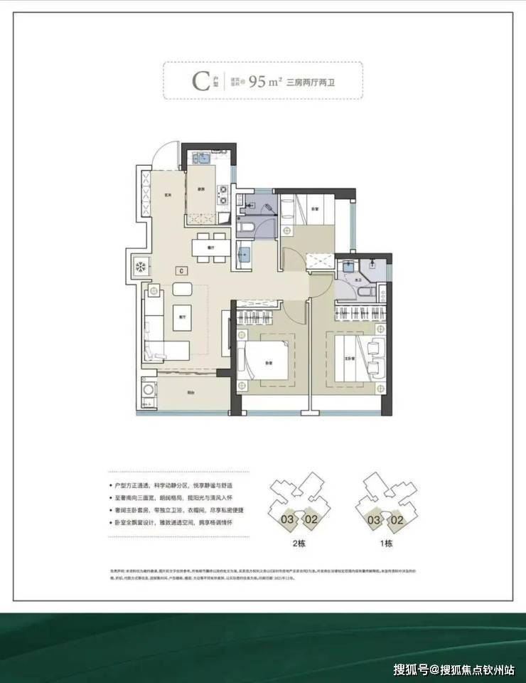 建面约95㎡还有一个3房2厅2卫的横厅户型,空间充足,阳台与餐厅两个对向飘窗可以做到南北通透,保证了整个房间的日照、通风效果。