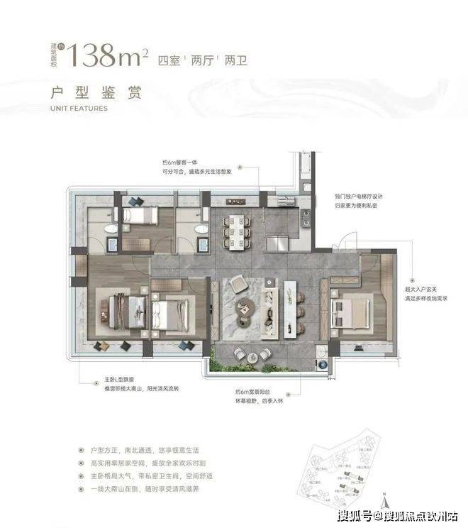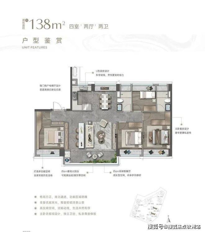 入户玄关巧妙隔绝视线,隐私感拉满。客餐厅南北通透,大客厅除传统布局外,还增设茶台区域,两者共享 6 米多宽景阳台,搭配 U 型厨房与方正餐厅,公区气场全开。