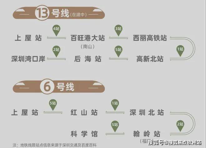 项目约直线距离400米抵达6号线、13号线(在建中)上屋站,6号线8站福田(翰岭站),13号线(建设中)4站南山、8站科技园(高新北站)。