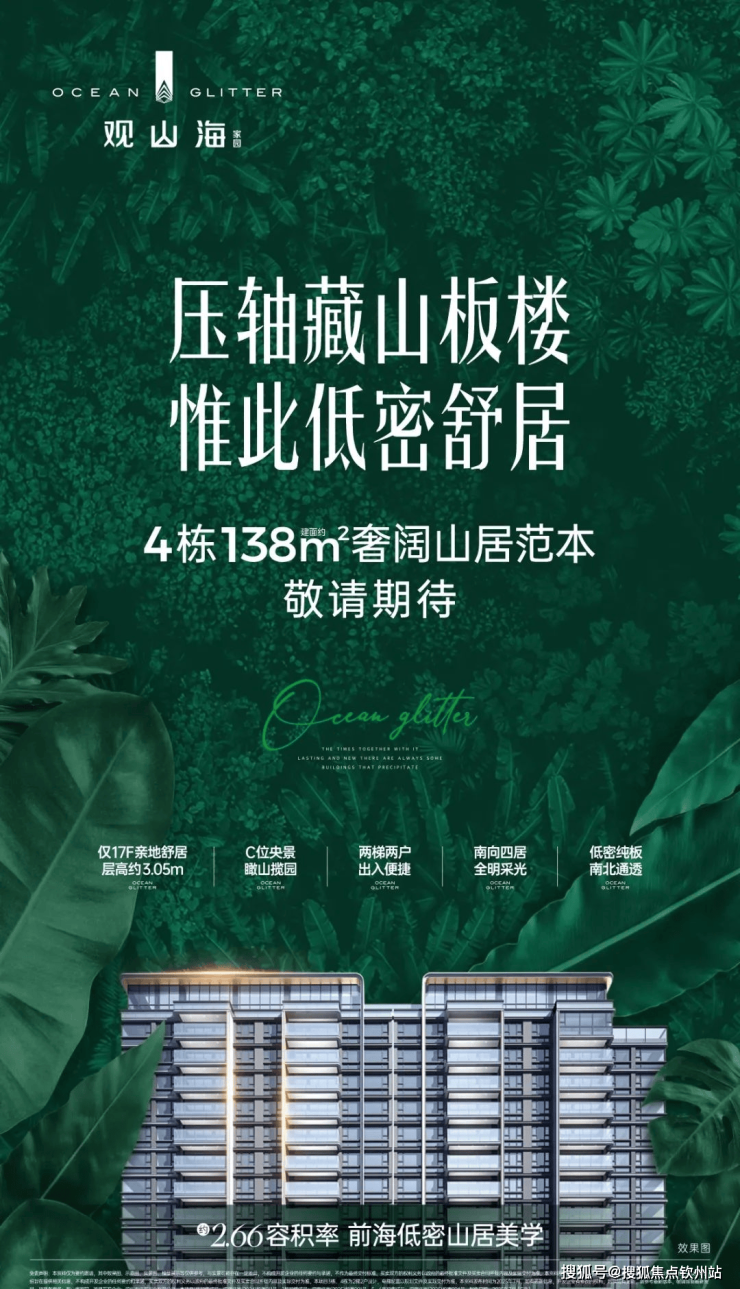 万众期待的南山前海观山海4栋楼王138平米即将推出,总层高17层,2梯2户,本次总房源仅64套,预计备案价10万/㎡,今年上半年南山成交第一,销售总额排第二,深圳罕有2.66容积率,超底密山居,自带强势吸粉力!(诚意登记验资200万)