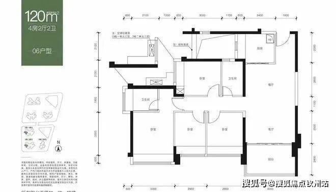 120㎡的4房2厅2卫,设计的是竖厅竖厅格局,客厅4米开间,4个卧室分别做到了3.3米/2.85米/2.5米/2.45米的宽度,L型厨房,得房率:75.34%(不含赠送),西南朝向。