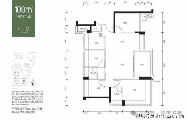 109㎡的4房2厅2卫,仅3栋3单元的01户型,设计的是横厅南北通透格局,客餐厅5.5米开间,4个卧室分别做到了3.7米/2.775米/2.55米/2.4米的宽度,L型厨房,得房率:75.98%(不含赠送),阳台主朝西北向。