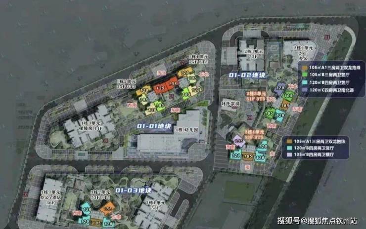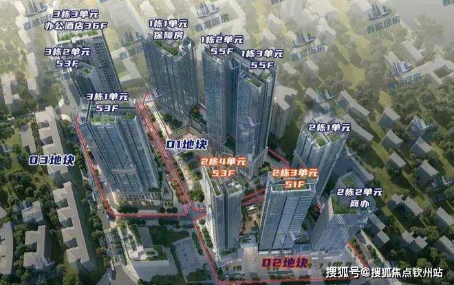 01地块,规划总建面约17.3万㎡,容积率9.28。规划住宅建面约8.9万㎡,商业建面约3.2万㎡。规划为3栋超高层塔楼住宅+幼儿园,1栋一、二单元193米55层,1栋三单元为保障房157米44层。规划1038套,其中保障房612套+回迁179套+可售247套,停车位834个。