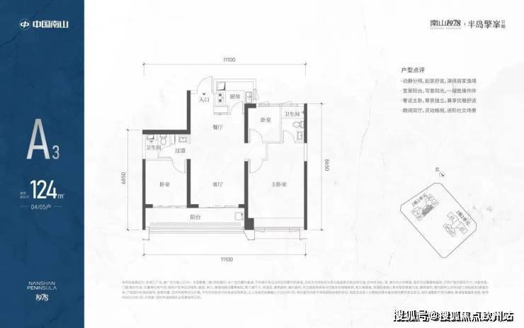 A3也是两条腿,分别是1-1栋04/05,主朝向是东南向,双龙抱珠格局。客厅拥有超大观景阳台,缺点是公卫是个暗卫,小次卧和主卫也对天井外走廊,采光不足。