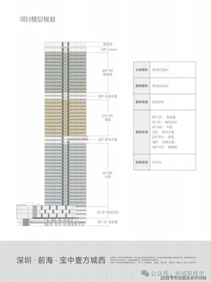 华侨城宝辰总高230米,为宝中最高楼;项目52层,分为中区、高区、超高区,6层起卖,11、39F为避难层,25-26F为空中会所,28F为空中大堂。除了空中大堂项目还有地下入库大堂+首层大堂,一共三重大堂。