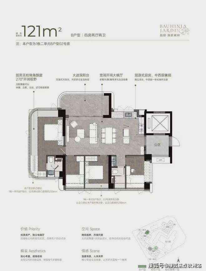 从空间布局来看,U 型厨房的设计极为人性化,大开间客厅与宽阳台是整个户型的最大亮点,西南向视野使得整个户型采光充足,贯通式阔景阳台与客厅、卧室双通,极大地拓展了生活空间的宽度。主卧的飘窗台也是一大亮点,弧形无柱转角飘窗不仅提供了广阔的视野,还增加了室内的采光。