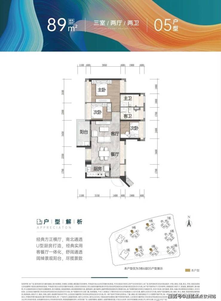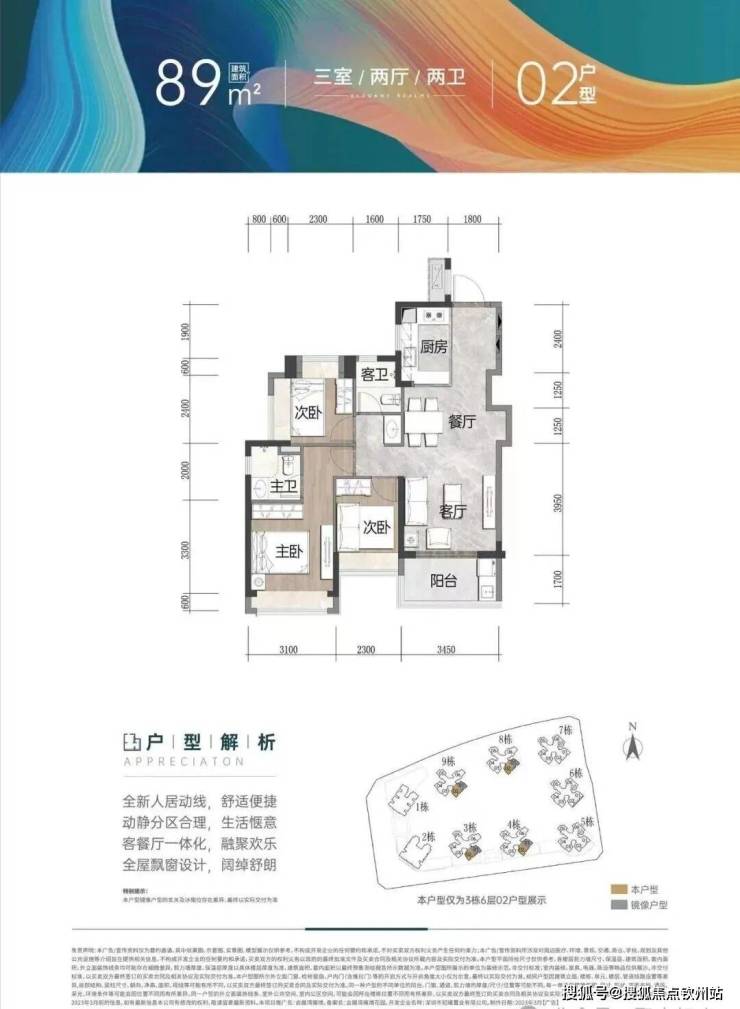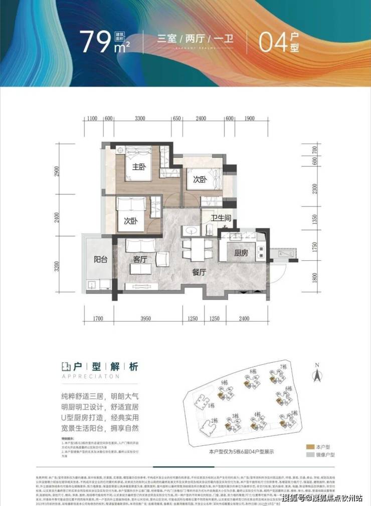 建面约78-80㎡的三房两厅一卫,设计的是竖厅格局,客厅3.2米开间,LDKB一体化,S墙设计预留冰箱卡槽位,动静分区。