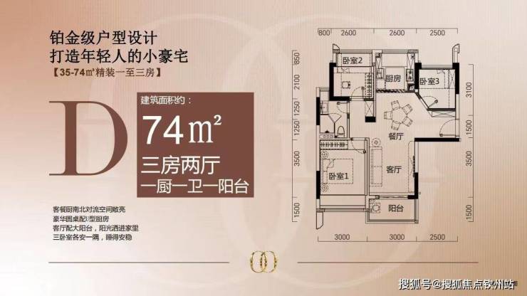 户型信息:主打建面约 35-74㎡的精装一至三房,有 35㎡一房一阳台、49㎡两房两厅、64㎡三房两厅、74㎡三房两厅等多种户型,得房率最高约 113%。