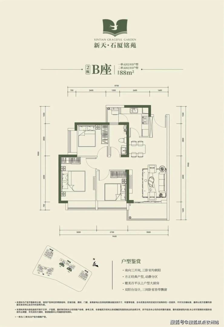 2栋B座一单元02、03户型、2栋B座二单元02、03户型:面积约为88㎡的3房2厅2卫
